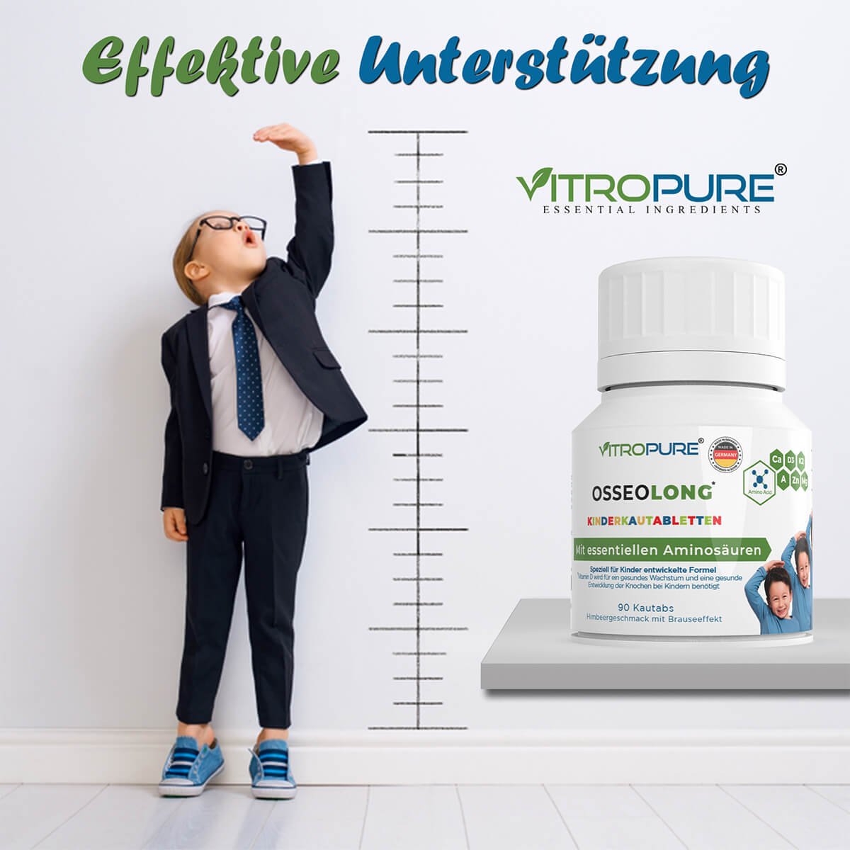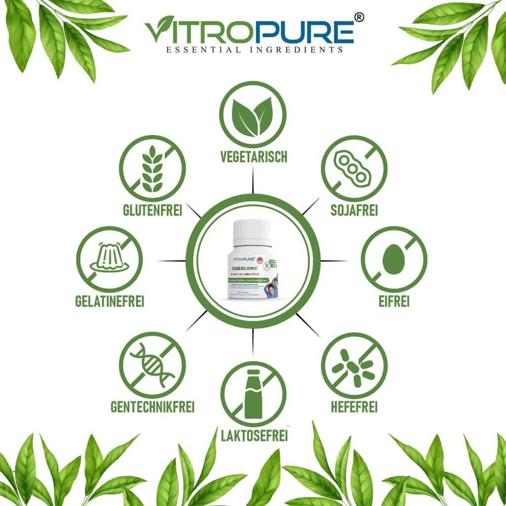 OsseoLong® ist eine speziell für Kinder entwickelte Formel mit Kalzium und Vitamin D3 zur Unterstützung der Knochenentwicklung bei Kindern, sowie auch mit Zink, Magnesium, Vitamin K2 und weiteren essentiellen Nährstoffen zur effektiven Unterstützung. Mikroverkapselte Vitamin D3 und K2 gewährleisten die höchste Stabilität, Reinheit und ein starkes biologisches Potenzial. Die zwei wachstumskritischen verzweigtkettigen Aminosäuren (BCAAs) werden aus Fermentation gewonnen und sind 100% Vegan. Der Brauseeffekt regt die Speichelproduktion an und garantiert ein angenehmeres Geschmackserlebnis und Mundgefühl. Die leckeren Kautabletten enthalten keine tierischen Produkte. Sie werden hauptsächlich aus hochwertigen vegetarischen Zutaten hergestellt. Frei von Gluten, Laktose, Allergen und Gentechnik.